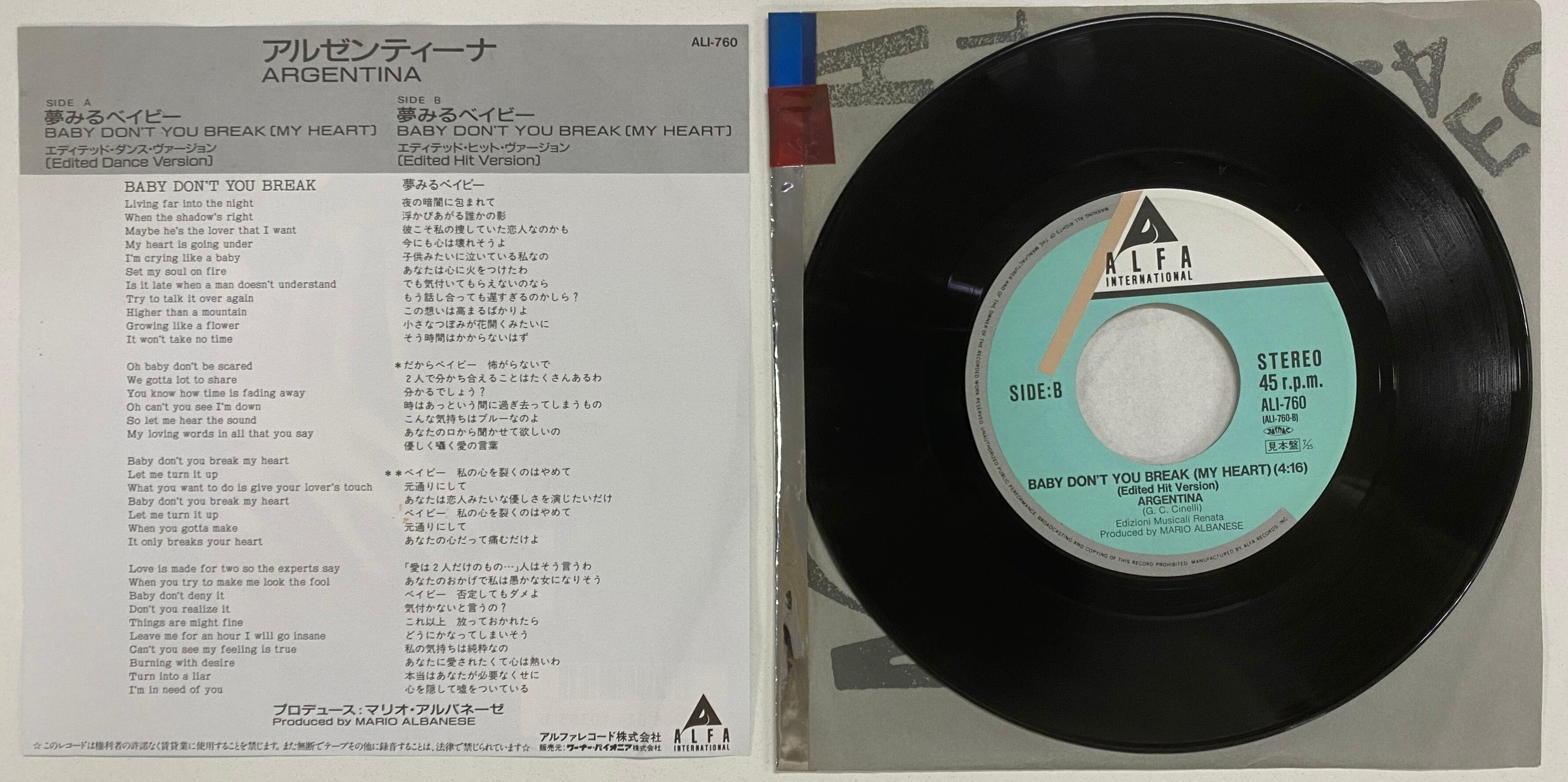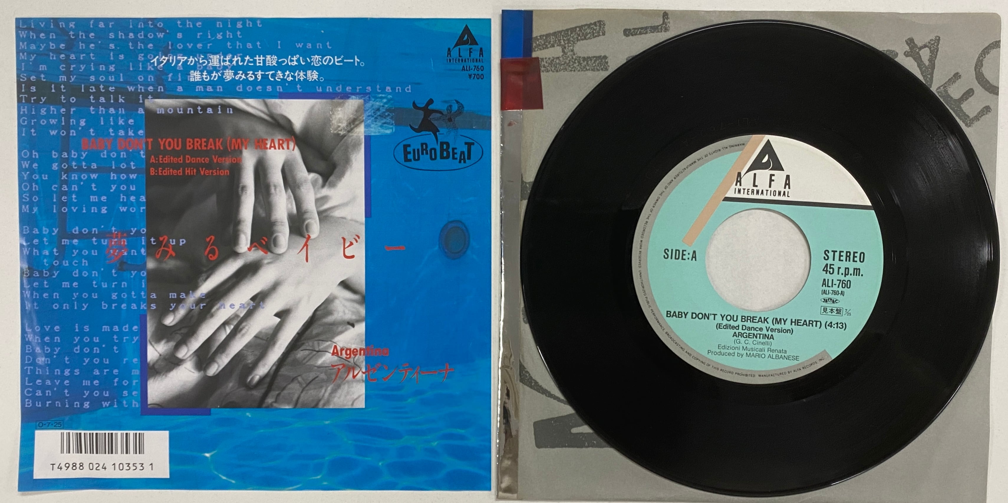 ARGENTINA/BABY DON’T YOU BREA(MY HEART)【日本盤・7インチ】邦題「夢みるベイビー」●1986年大ヒットユーロ!