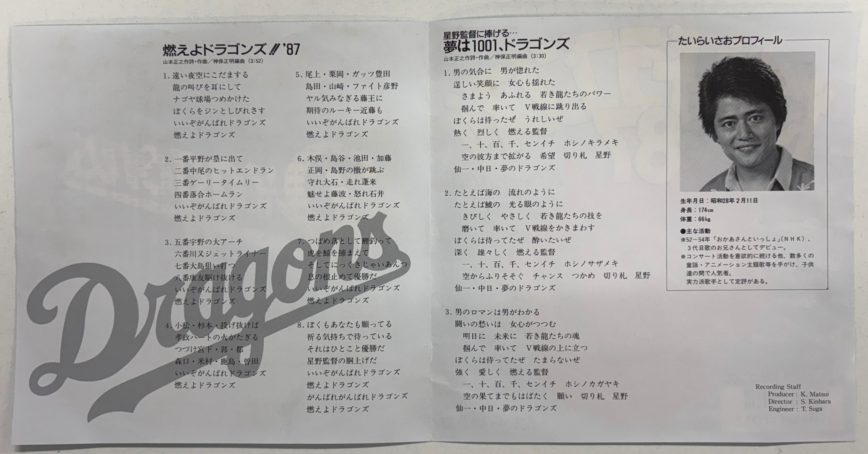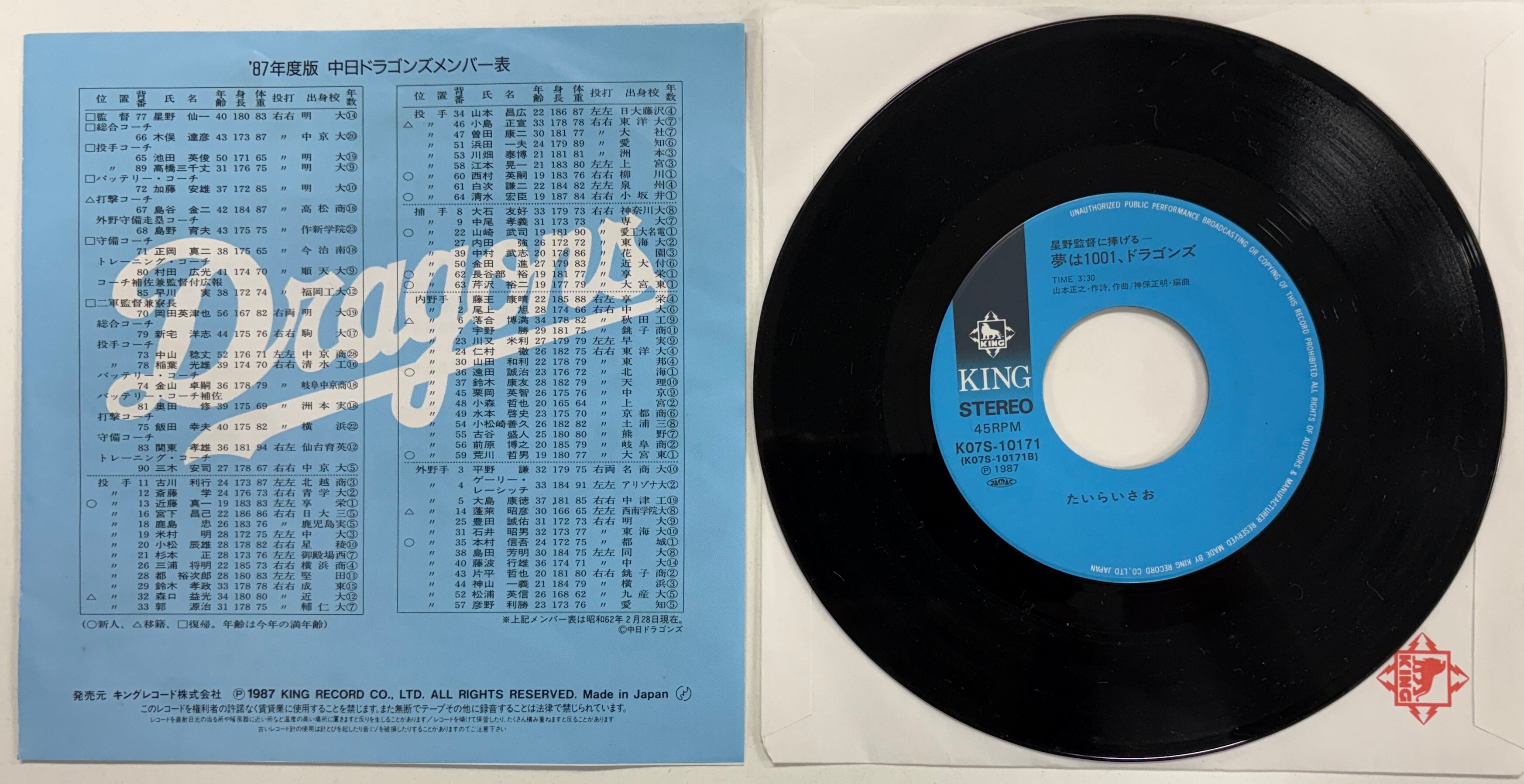 たいらいさお「燃えよドラゴンズ!!’87/夢は1001、ドラゴンズ」【7インチ】B面が「プロ野球音の球宴」で大人気!