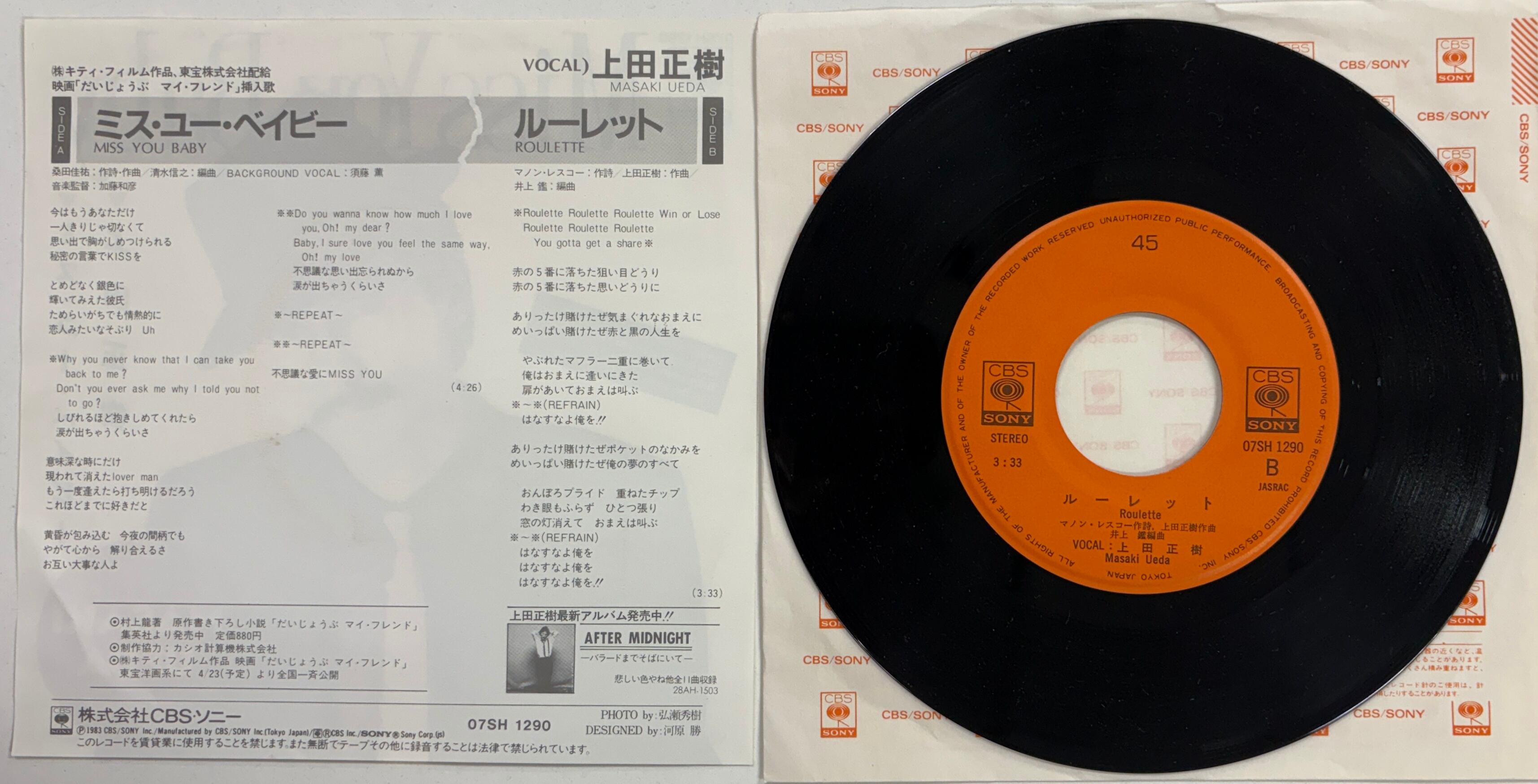 和製レゲエ「ルーレット」収録(B面)の7インチシングル。A面は映画『だいじょうぶマイ・フレンド』挿入歌「MISS YOU BABY」。7インチシングルはクリックポストで6〜7枚まで同梱できます(185円)。