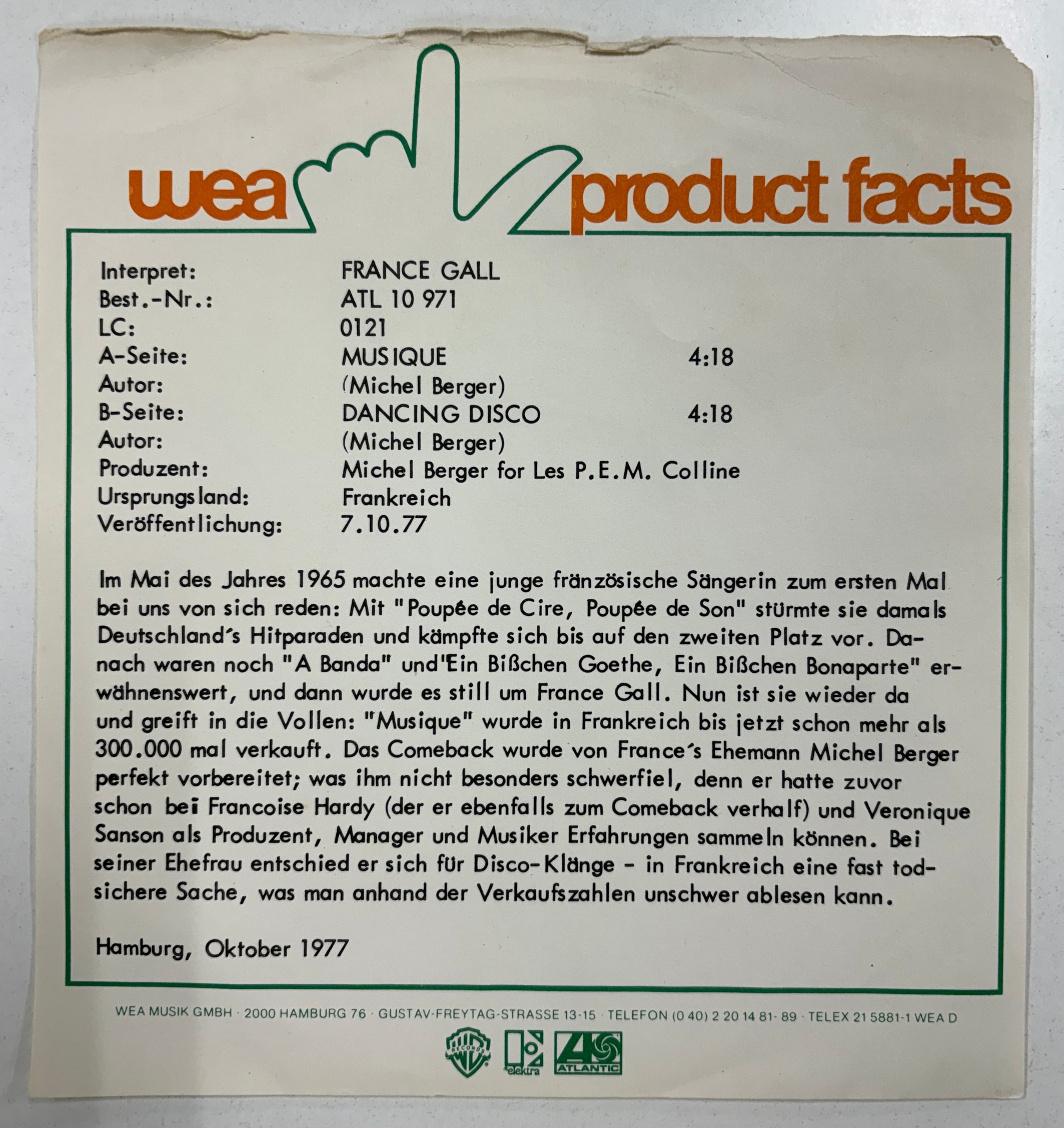 FRANCE GALL「MUSIQUE/DANCING DISCO」【ドイツ盤・7インチ】極上メロウなフレンチ・ディスコ